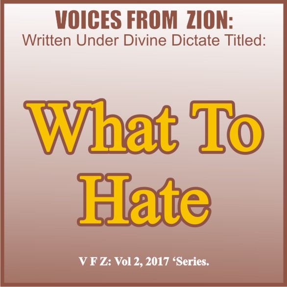 There is an all time never outdated prayers, an all important required prayer each living being need to always pray for (one)self. It is one thing to know what to do and it is entirely another thing to do it exactly. Many minds are full of right words, loaded with the right thing to do but never attempted doing it once. This edition of Voices From Zion Titled: WHAT TO HATE is packaged for you to know the importance of what you have left undone and how to be serious with the fact of life and take the word of God as the most valuable assets in life. The fear of the Lord is to hate evil: pride, and arrogancy, and the evil way, and the froward mouth, do I hate. Proverbs 8:13